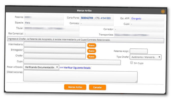 Al momento de Marcar el ingreso además de registrar la fecha de ingreso a planta, se debe completar información complementaria como el Chofer, Intermediaro, Entregador, Patente Acoplado, Cupo o Contrato.