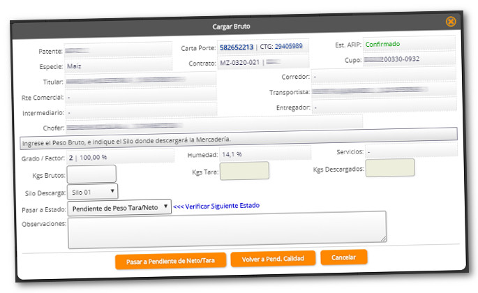 En este punto se debe cargar el peso bruto e indicar el silo de descarga.