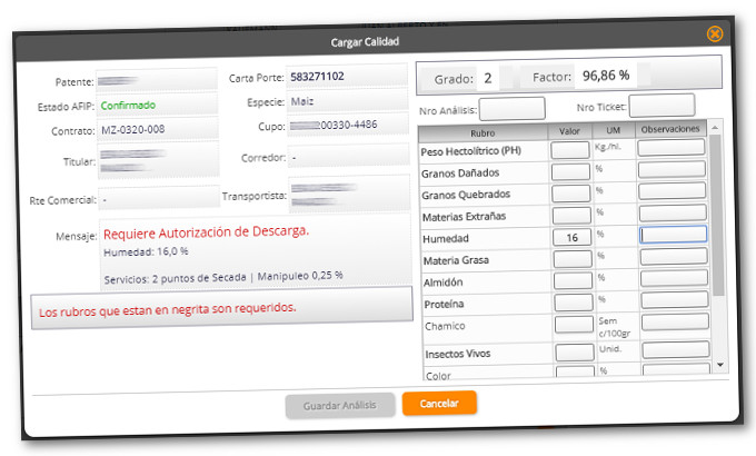 En este punto se carga la tara, quedando registrados los kilos netos descargados y el cálculo de Mermas según Factor de Calidad.