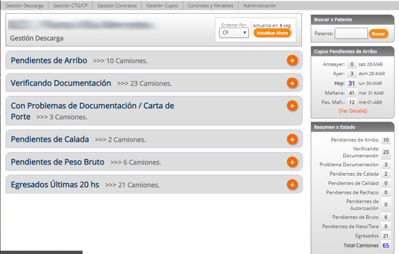 En dicho tablero aparecerán los camiones del día, agrupados por el estado en que se encuentran, además existe un buscador por patente para encontrar rápidamente un camión al que se le deba cargar una acción.