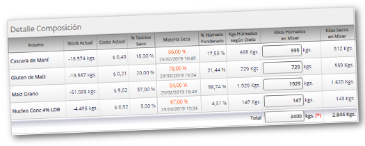 Esto nos permite que el operario pueda actualizar el porcentaje seco de los insumos día a día según corresponda, sin necesidad de volver a retocar las dietas, ya que el sistema calcula automáticamente el porcentaje húmedo que corresponde de acuerdo a la humedad de cada insumo. De esta manera los cambios a las dietas solo se realizan ocasionalmente desde la administración.