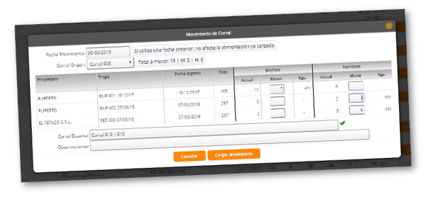 Para realizar un movimiento se seleciona el corral de origen y el sistema nos muestra todas las tropas y sus cantidades discriminadas x sexo que estan actualmente en ese corral. Simplemente ingresamos la cantidad que vamos a mover, y seleccionamos el corral de destino y se puede generar el movimiento.